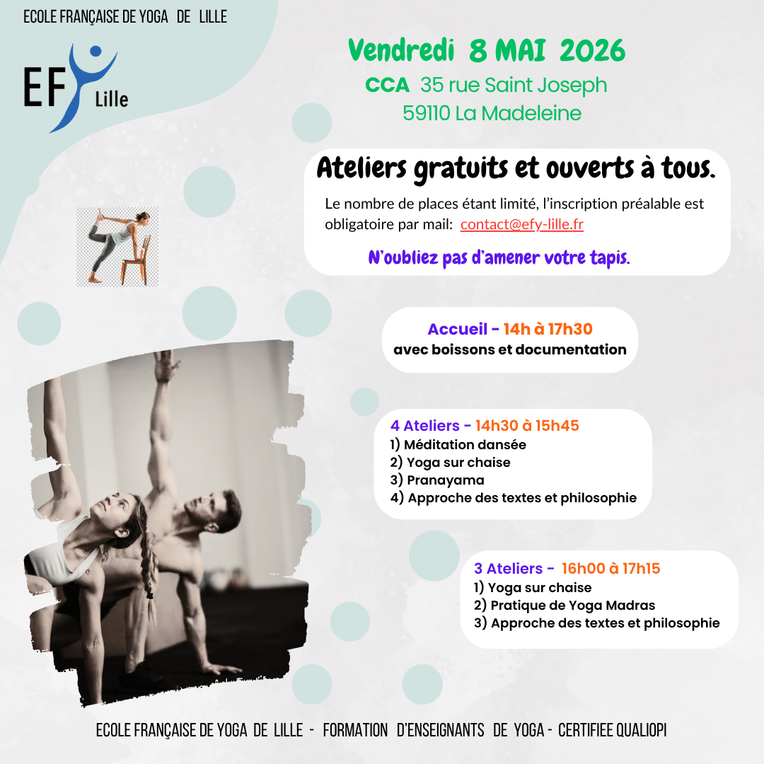 Le 8 Mai 2026 de 14h à 17h30, au CCA le Millénaire, 35 Rue Saint Joseph à La Madeleine 59110. Chers amis yogis, venez participer à l’un des ateliers gratuits et ouverts à tous, dans la limite des places disponibles. N’oubliez pas vos tapis. de 14h à 17h30: accueil avec boissons et documentations. de 14h30 à 15h45 Quatre ateliers sont proposés : 1) méditation dansée. 2) yoga sur chaise. 3) pranayama. 4) approche des textes et philosophie.